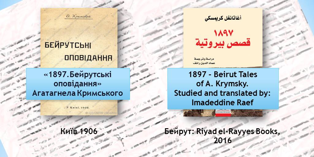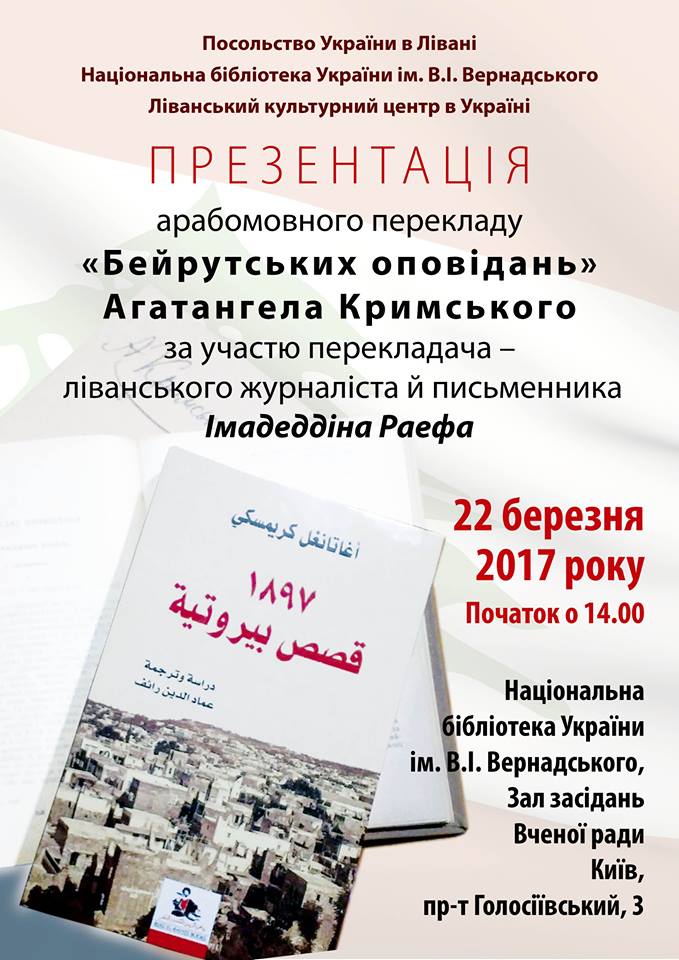 22 березня 2017 року в Національній бібліотеці України імені В.І. Вернадського (НБУВ) за сприяння Посольства України в Лівані та Ліванського культурного центру в Україні відбудеться презентація перекладу «Бейрутських оповідань» Агатангела Кримського арабською мовою.